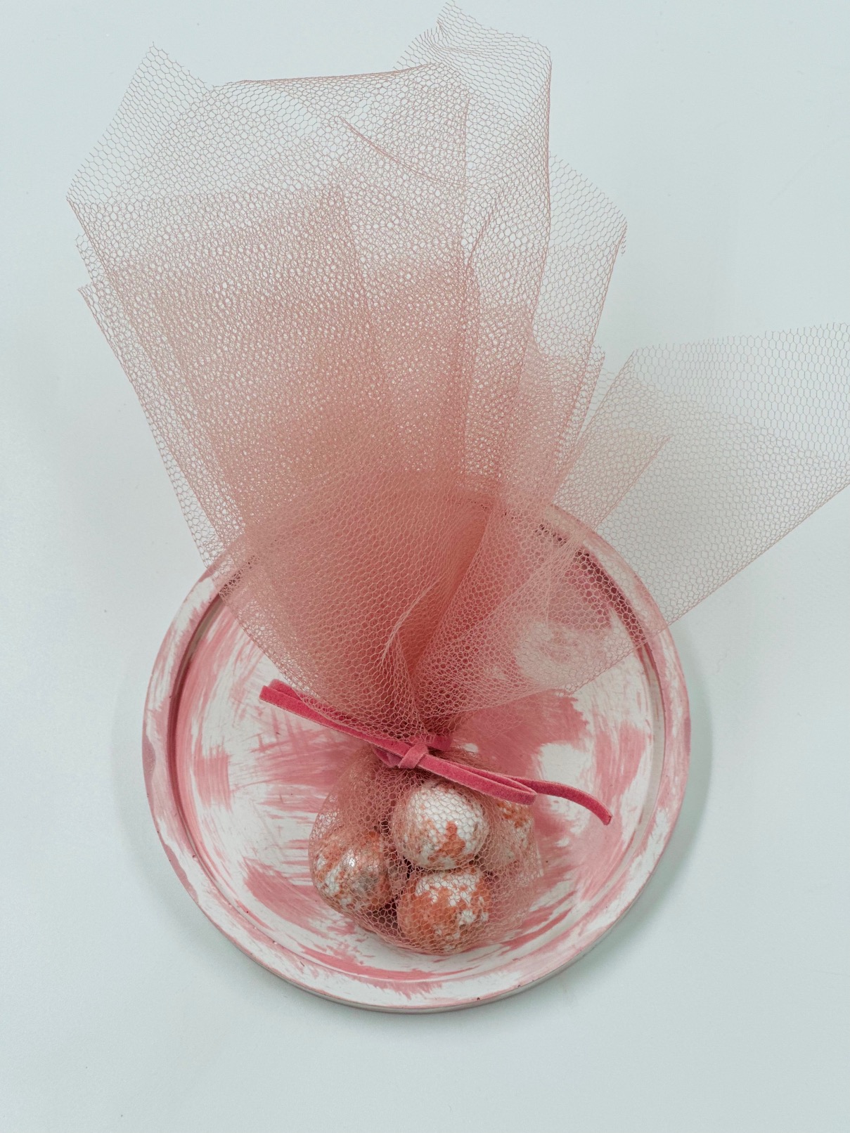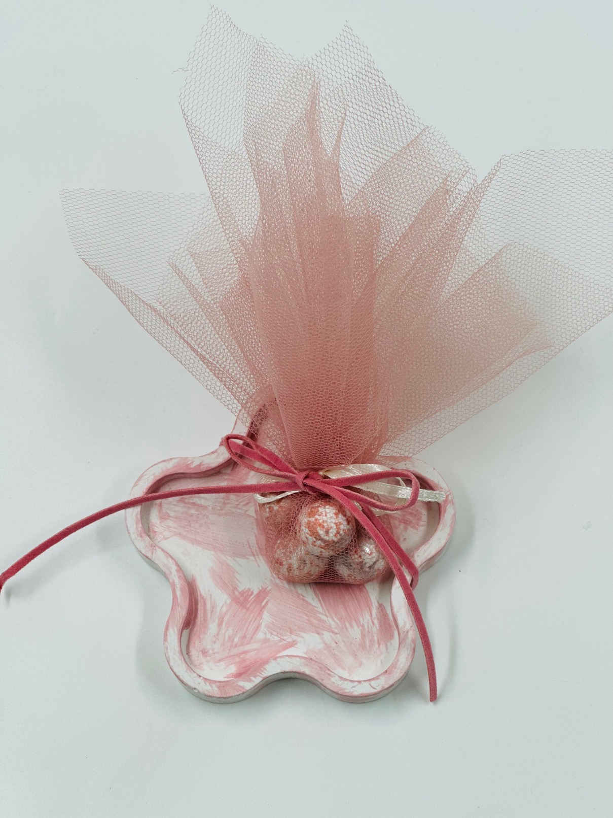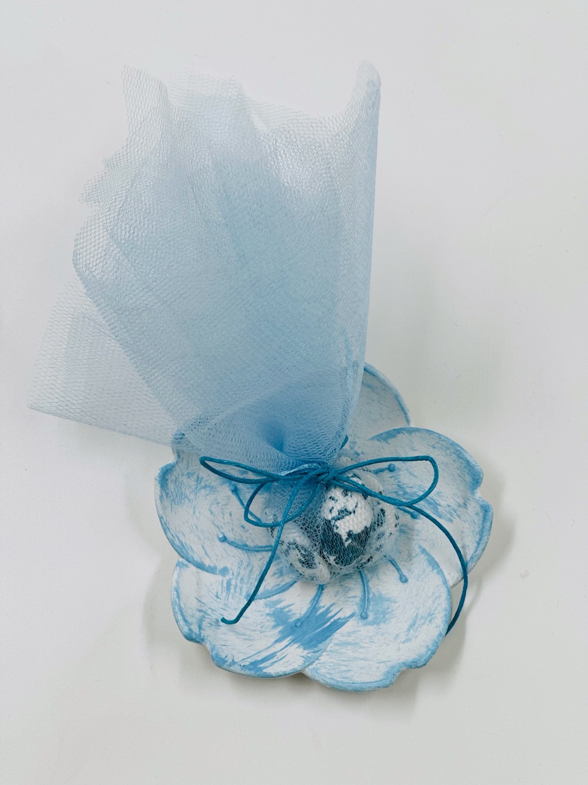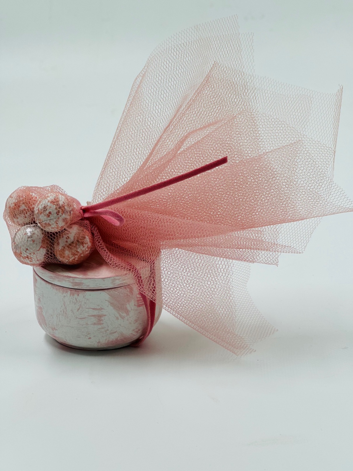 Χειροποίητη μπομπονιέρα υγρής πορσελάνης . Πανέμορφες σε οποιοδήποτε χρωματισμό και μοναδικές τεχνικές διχρωμιών. Επίσης μπορούν να σκαλιστούν με οποιδήποτε σχέδιο επιλογής σας για κάτι μοναδικό και ιδιαίτερο. Στη τιμή δεν περιλαμβάνεται ο στολισμός και τα κουφέτα.